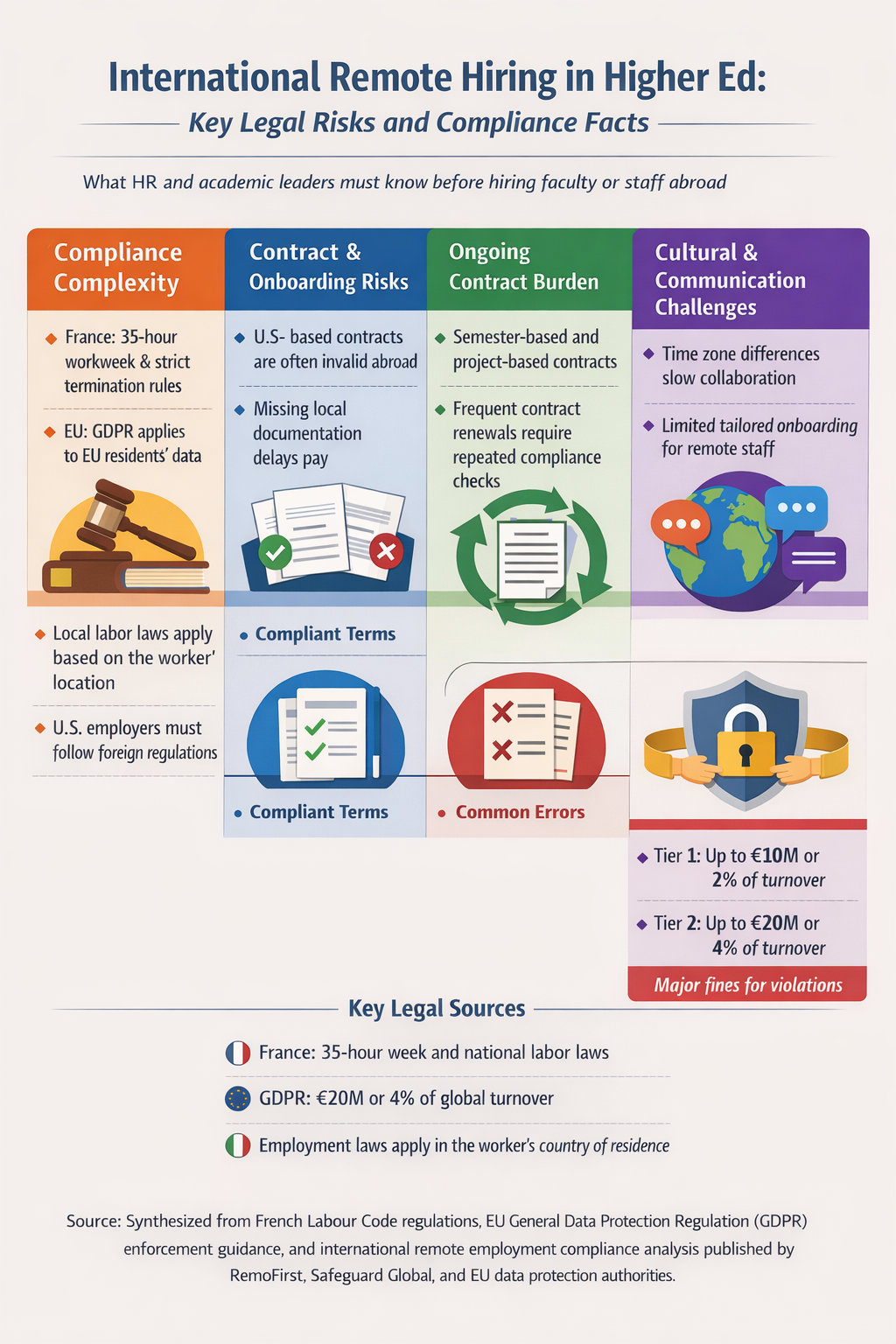 For higher education specifically, Safeguard Global notes that institutions seeking to hire renowned faculty members in the United States and abroad must comply with the specific and varied employment laws of their home countries regarding remote work. Noncompliance can carry heavy penalties for the university.