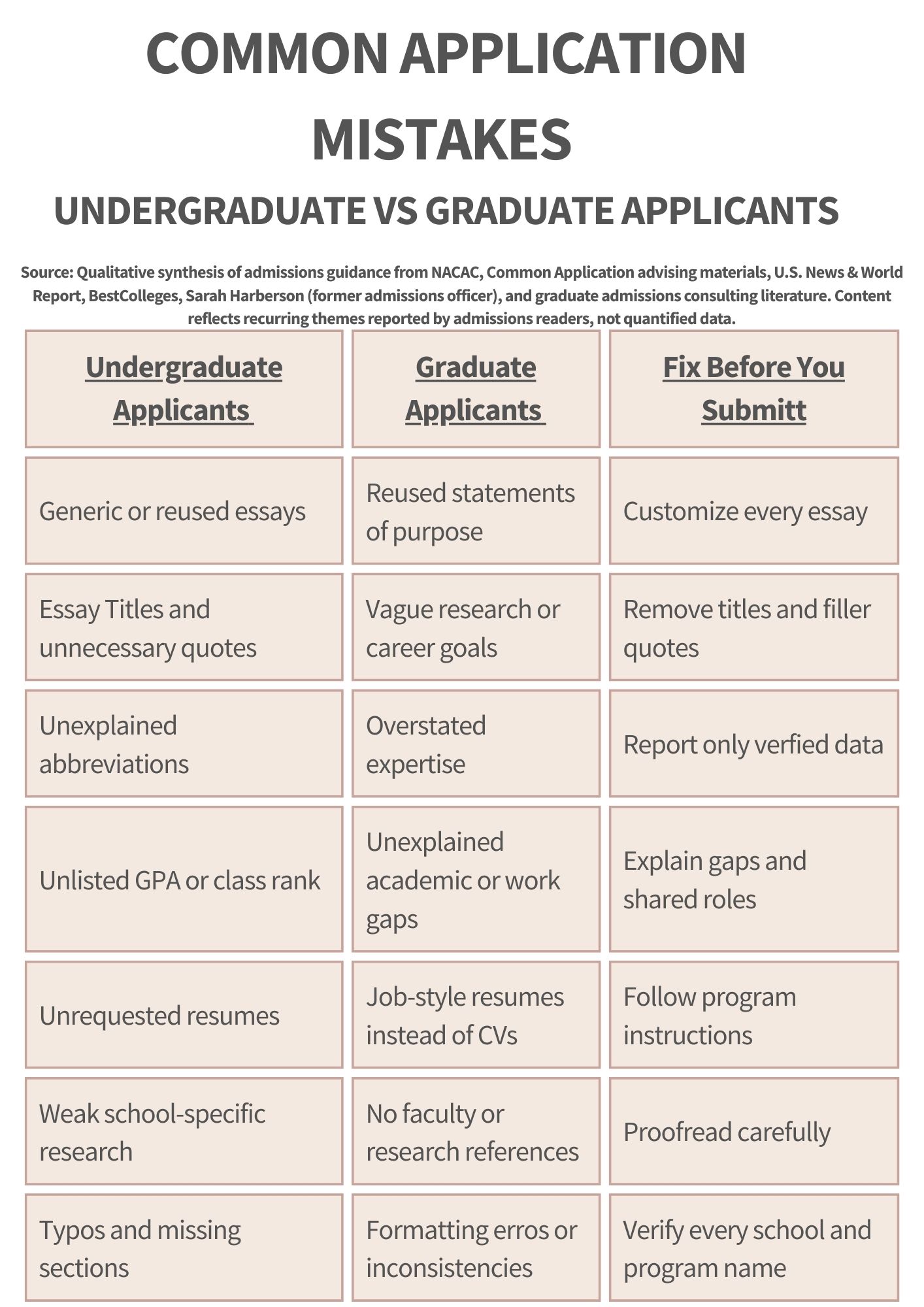 Admissions officers read thousands of applications each cycle, and small errors can push yours into the reject pile before anyone fully considers your qualifications. Whether you are a high school student applying through the Common App, a transfer student seeking a new institution, or a graduate student submitting to competitive programs, this guide helps you across the board by identifying the most common mistakes and showing you how to fix them. College application mistakes fall into predictable categories, and most are preventable with careful review.