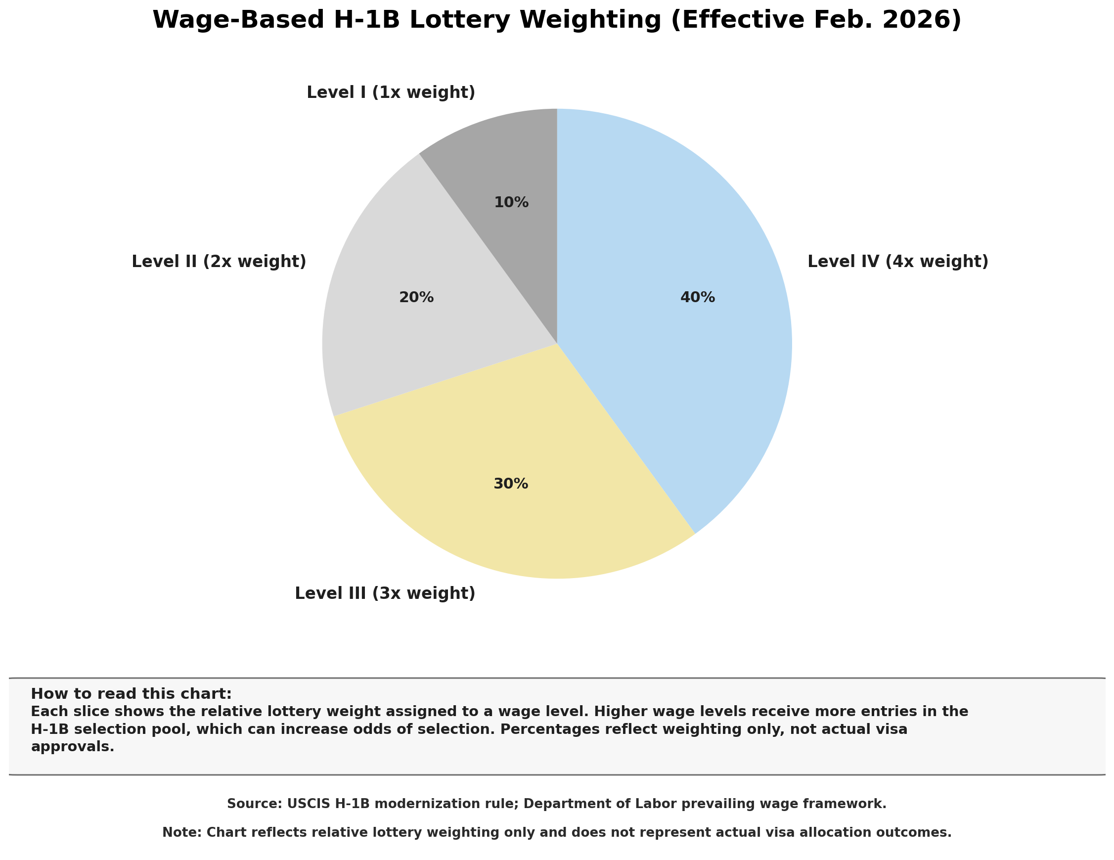 Under the new rules, petitions are weighted by wage level. Positions at the highest wage level (Level IV) receive four entries in the selection pool. Level III positions receive three entries. Level II receives two. Level I receives one. Higher-wage positions have up to four times greater odds of selection.