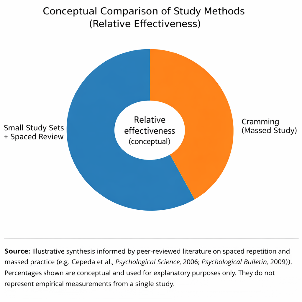 The evidence is clear: smaller, focused study sets processed through active retrieval and spaced repetition produce better results than marathon review sessions. Your study habits shape not just your immediate exam performance but your long-term retention and ability to apply knowledge in new contexts.