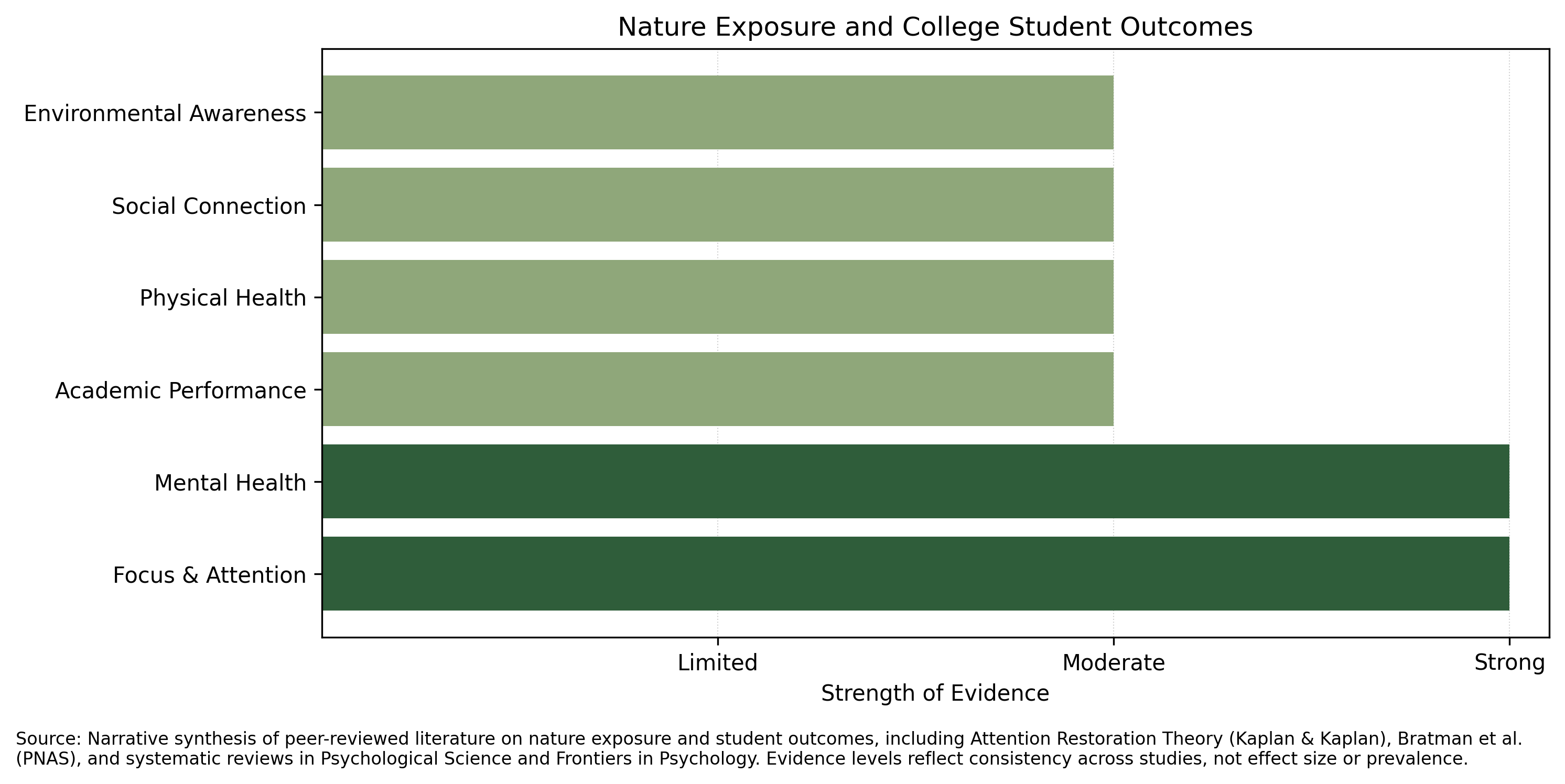 The evidence points in one direction. Nature exposure improves cognitive function, mental health, physical wellness, social skills, and environmental awareness. For college students facing intense academic pressure and mental health challenges, time outdoors offers a practical, accessible, and effective tool for success.